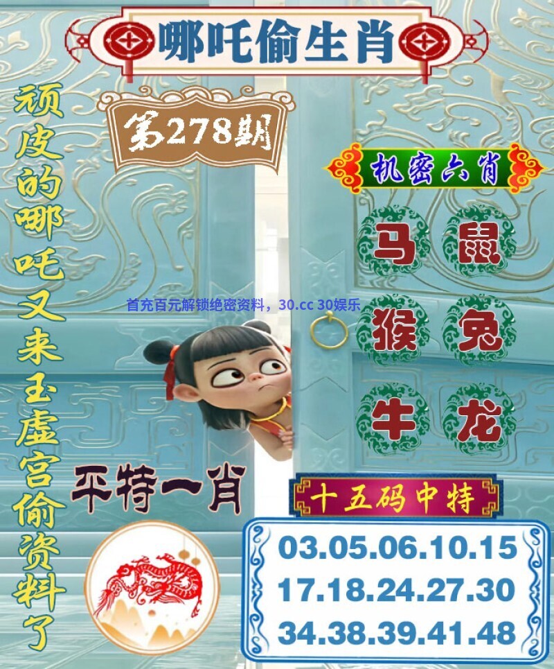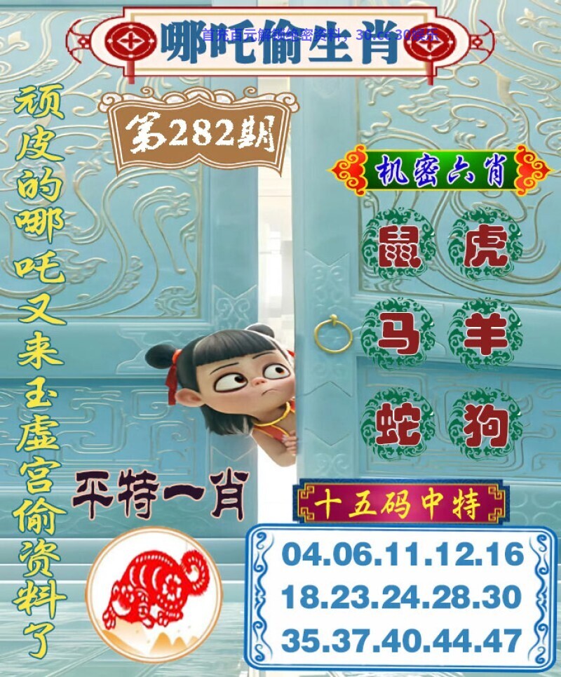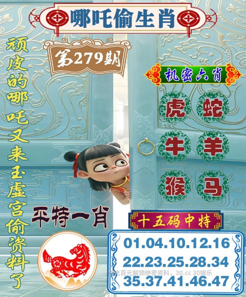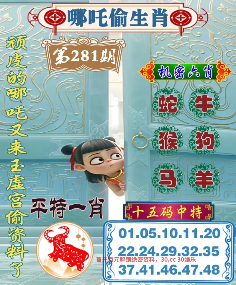 281期【解哪吒偷生肖】 解料:此地无银三百两,本期中奖此中贵 机密六肖:蛇牛猴狗马羊 15码中特:01.05.10.11.20.22.24.29.32.35.37.41.46.47.48 |